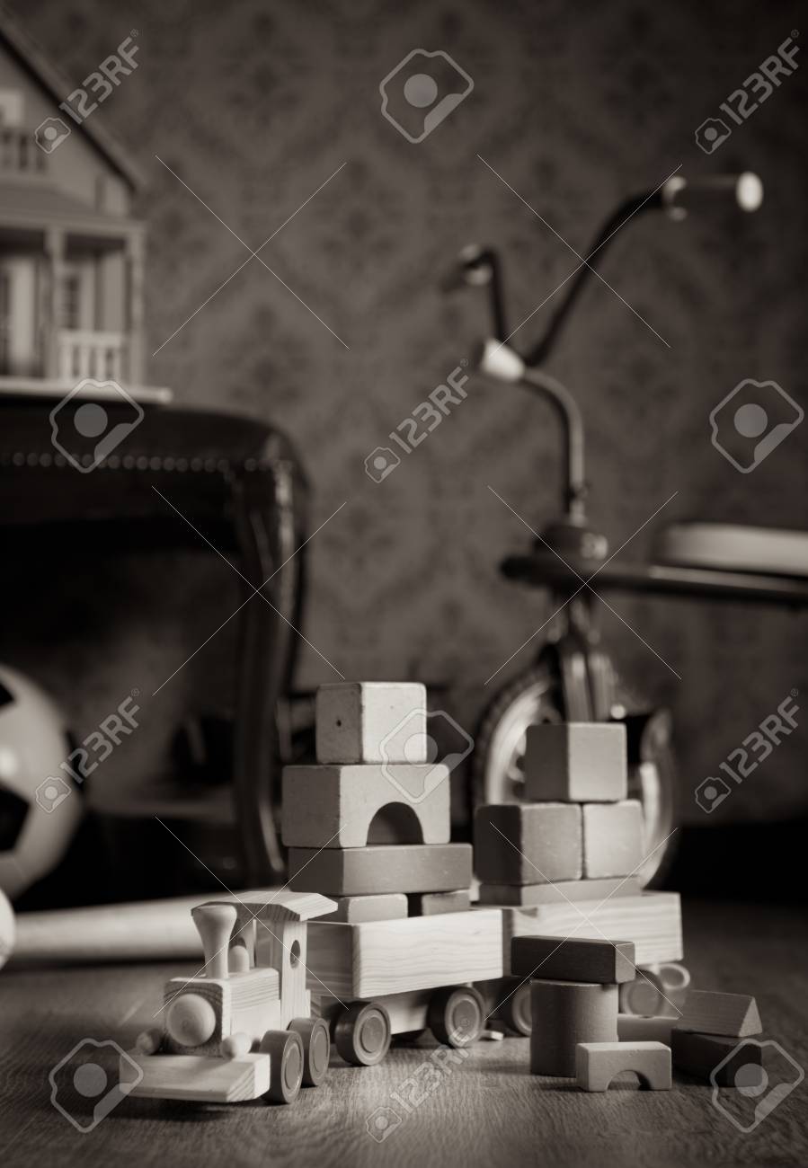Treno Di Legno E Vintage Giocattoli Colorati Sul Pavimento In Legno E Carta Da Parati Retro Su Sfondo
