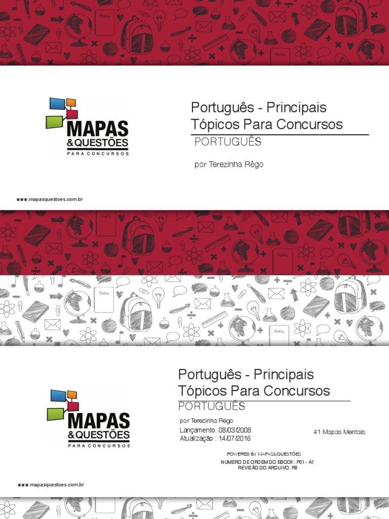 O acordo ortografico e um tema muito discutido atualmente nos concursos publicos e a partir de 1o de janeiro de 2013 sera cobrado em sua integra por todas as organizadoras do genero. O objetivo do mapa mental de portugues para concursos publicos e auxiliar o estudante na busca por sua aprovacao otimizando sua capacidade de compreensao e memorizacao e auxiliando o na fixacao dos conteudos mais cobrados nas provas das principais bancas do pais. Veja gratis o arquivo mapa mental portugues completo 220 mapas em 1 2017 2018 enviado para a disciplina de portugues categoria.