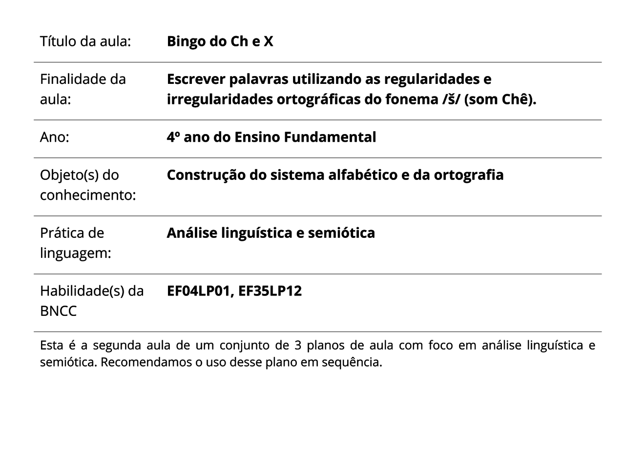 Plano De Aula 4º Ano Lingua Portuguesa Bingo Do Ch E X