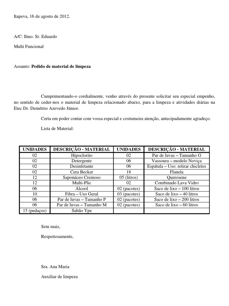 Modelo Carta De Apresentacao Para Auxiliar De Limpeza
