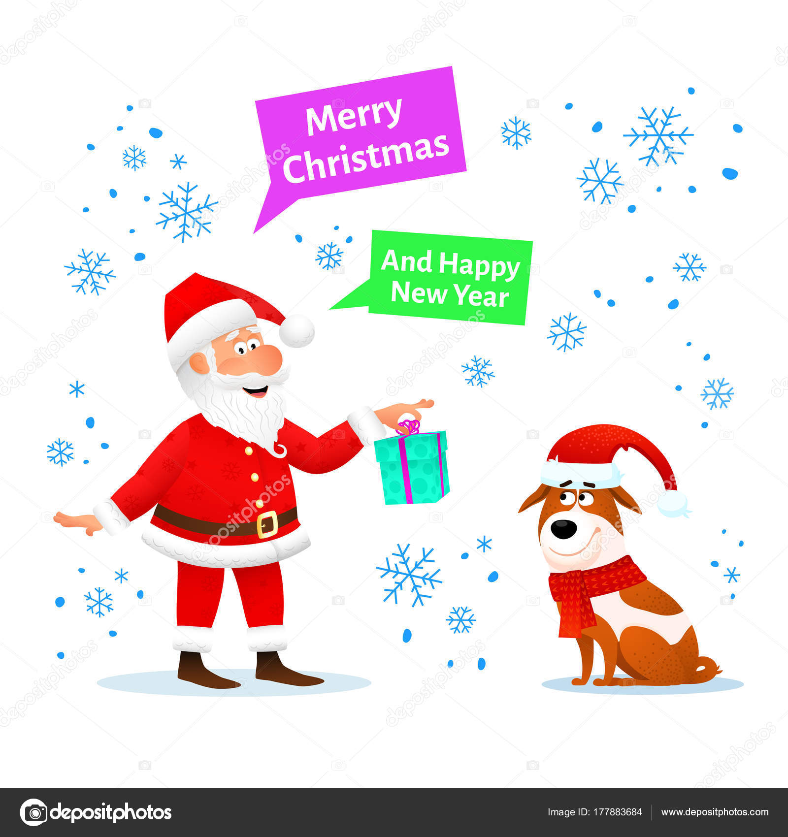 Feliz Natal Feliz Ano Novo Mao Desenhada Cao Cartao Ilustracao Cachorro Engracado No Chapeu De Papai Noel Com Caixas De Presente E Citacao De