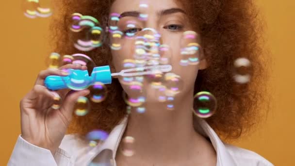 Garota De Moda Engracada Soprando Bolhas De Sabao Em Fundo Laranja Close Up Camera Lenta