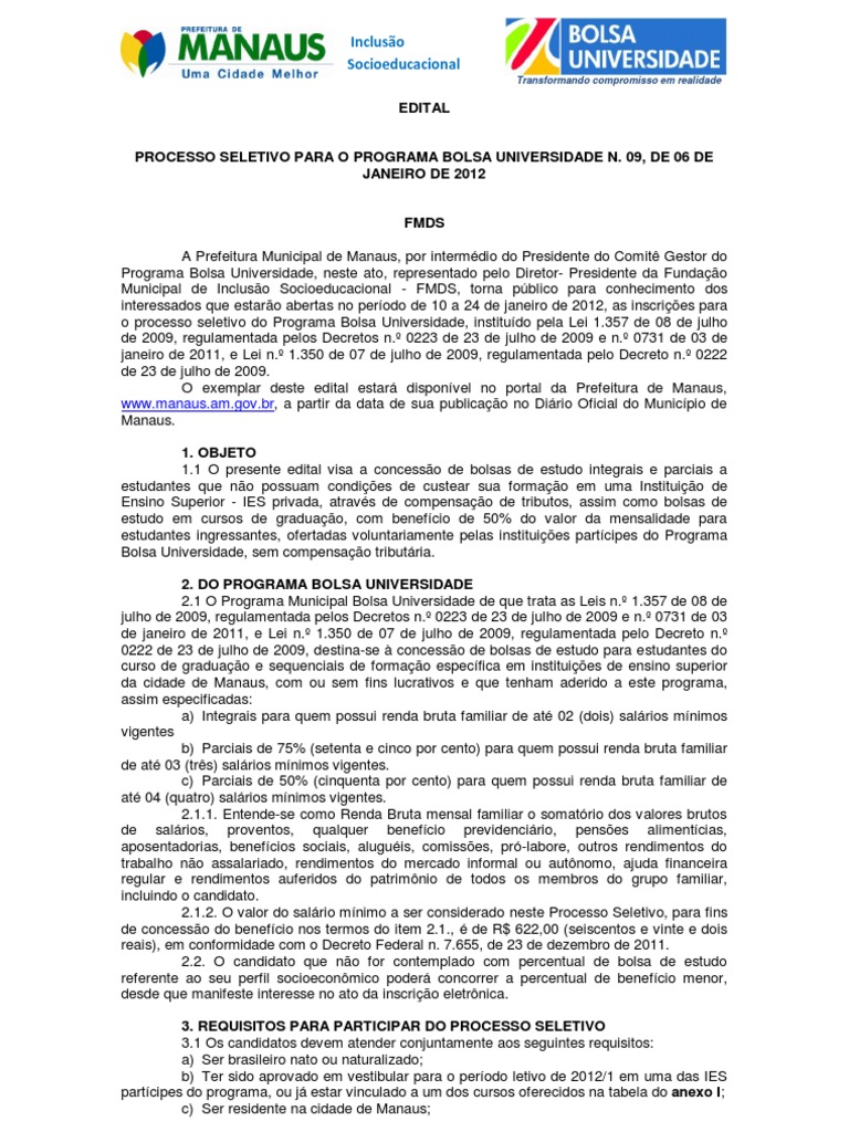 Edital Bolsa Universidade Manaus 2012 1