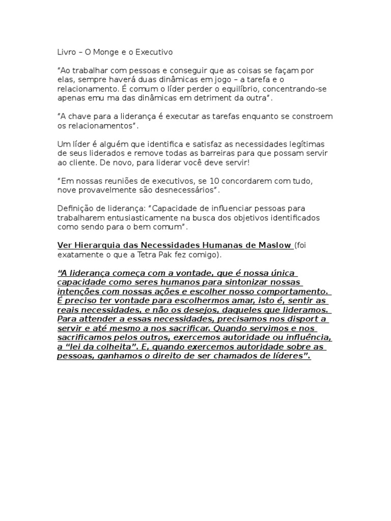 Resumo Do Livro O Monge E O Executivo Uma Historia Sobre A