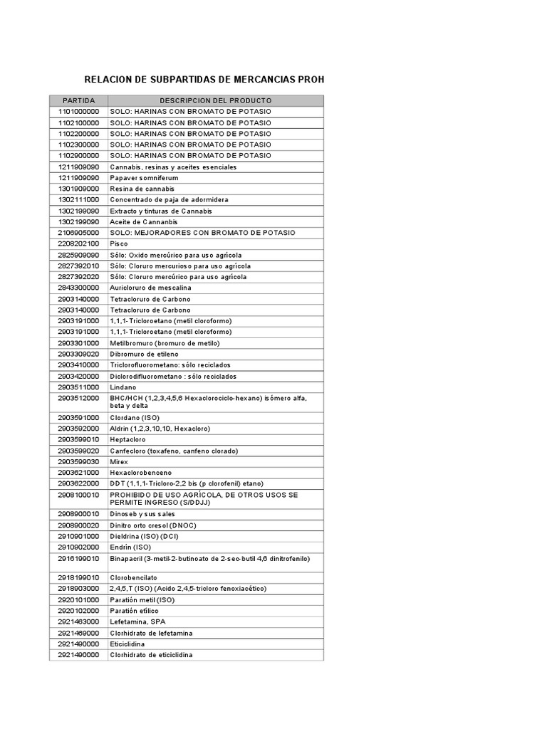Relacion De Subpartidas De Mercancias Prohibidas