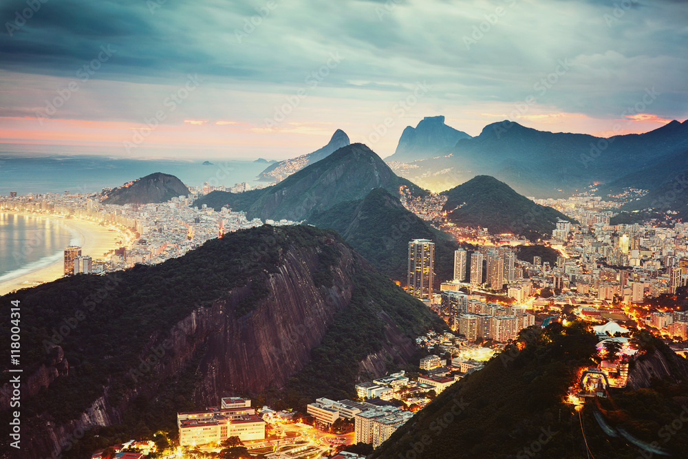 Night View Of Rio De Janeiro With Ipanema Beach Hills