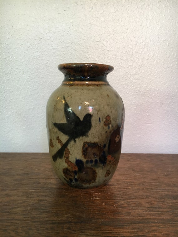 Tonala Mexican Pottery Vase Salvador Vasquez Bird Design Marked S Burnished 7
