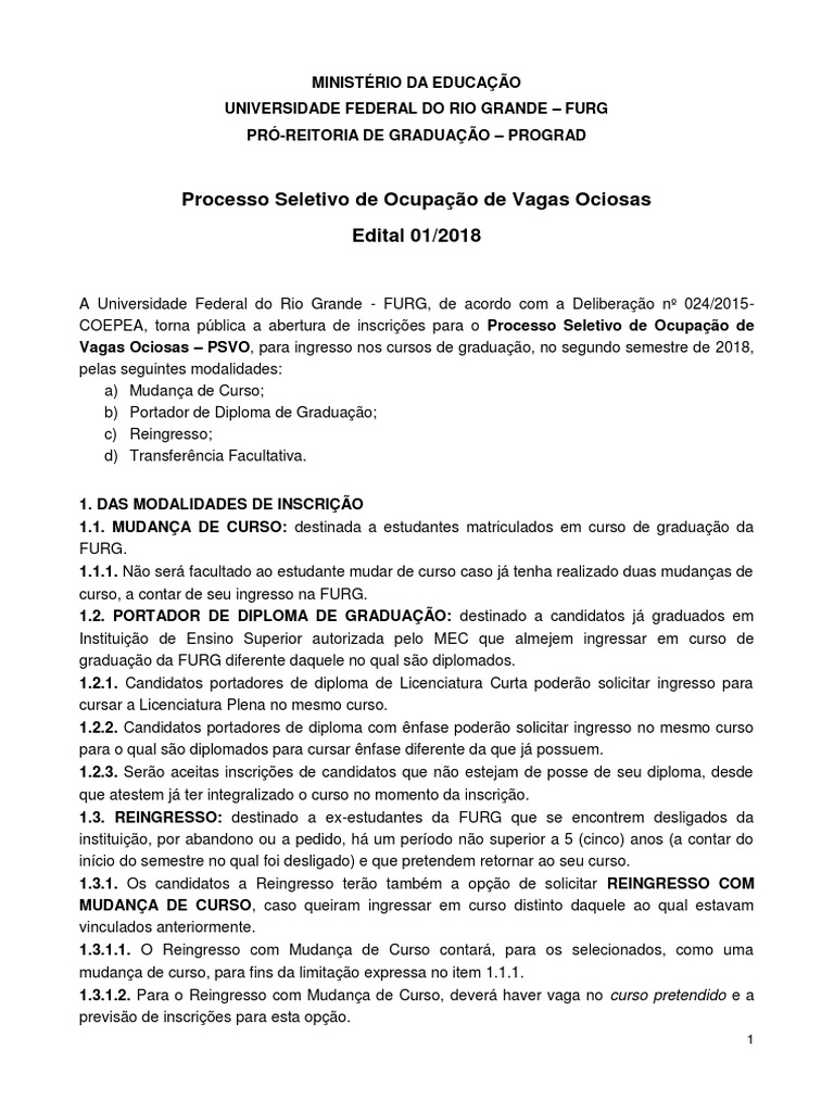 Publicado en 06122019 actualizado en 06122019 pm 16h45. A furg divulgou nesta segunda 28 o edital do processo seletivo de vagas ociosas psvo para ingresso no segundo semestre de 2018 em cursos de graduacao nas modalidades reingresso mudanca de curso transferencia facultativa e portador de diploma de graduacao.