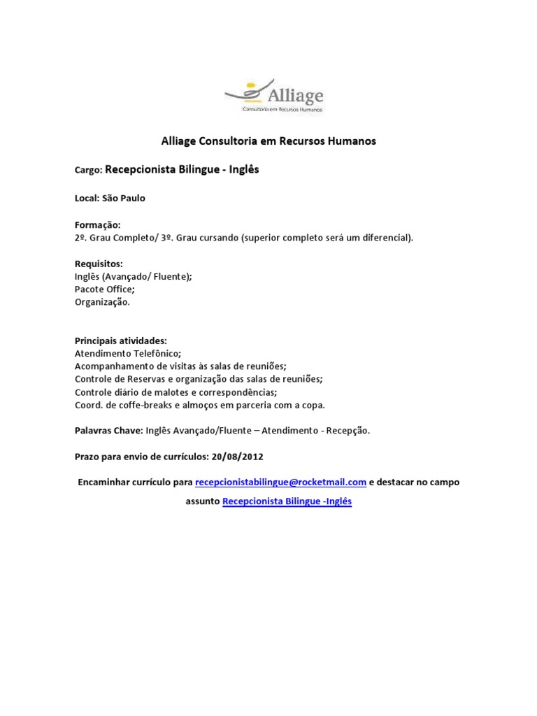 Vaga Alliage Sp Recepcionista Bilingue